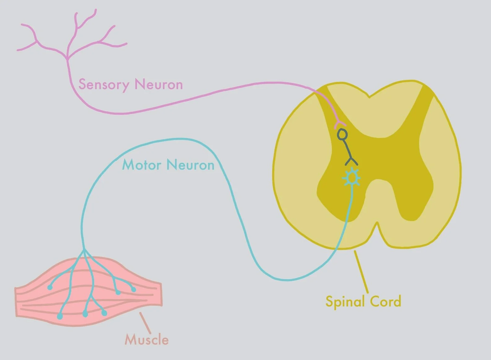Once the information has reached the spinal cord, a motor neuron is activated. Motor neurons are responsible for sending information to our muscles, initiating movement. The motor neurons deliver the information to your muscles, initiating movement of your hand or leg, and triggering the reflex.